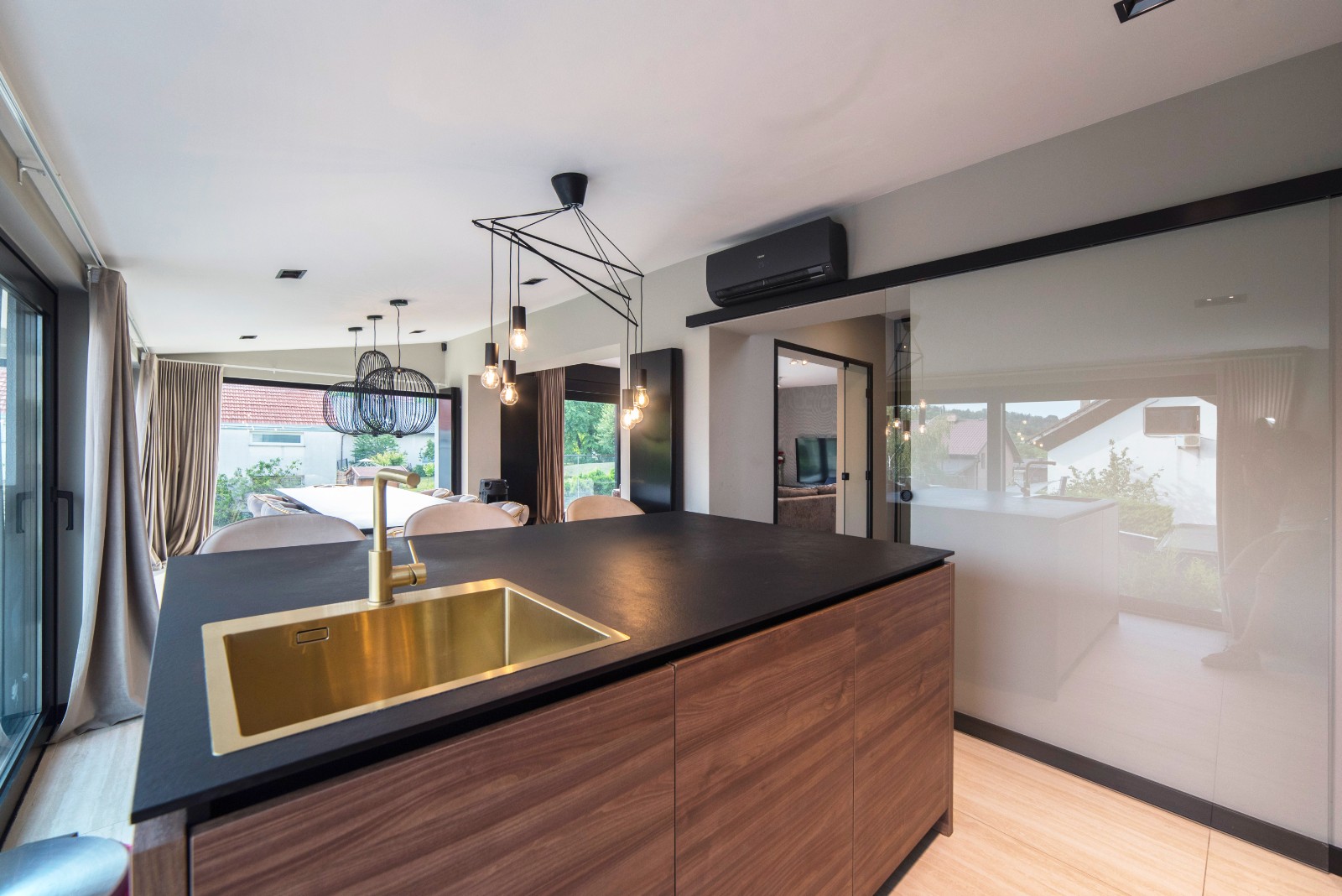 Kuhinja je prostrana i kompletno opremljena svime potrebnim za svakodnevicu a povezana je s blagovaonicom i velikim dnevnim boravkom s pogledom na okoliš.